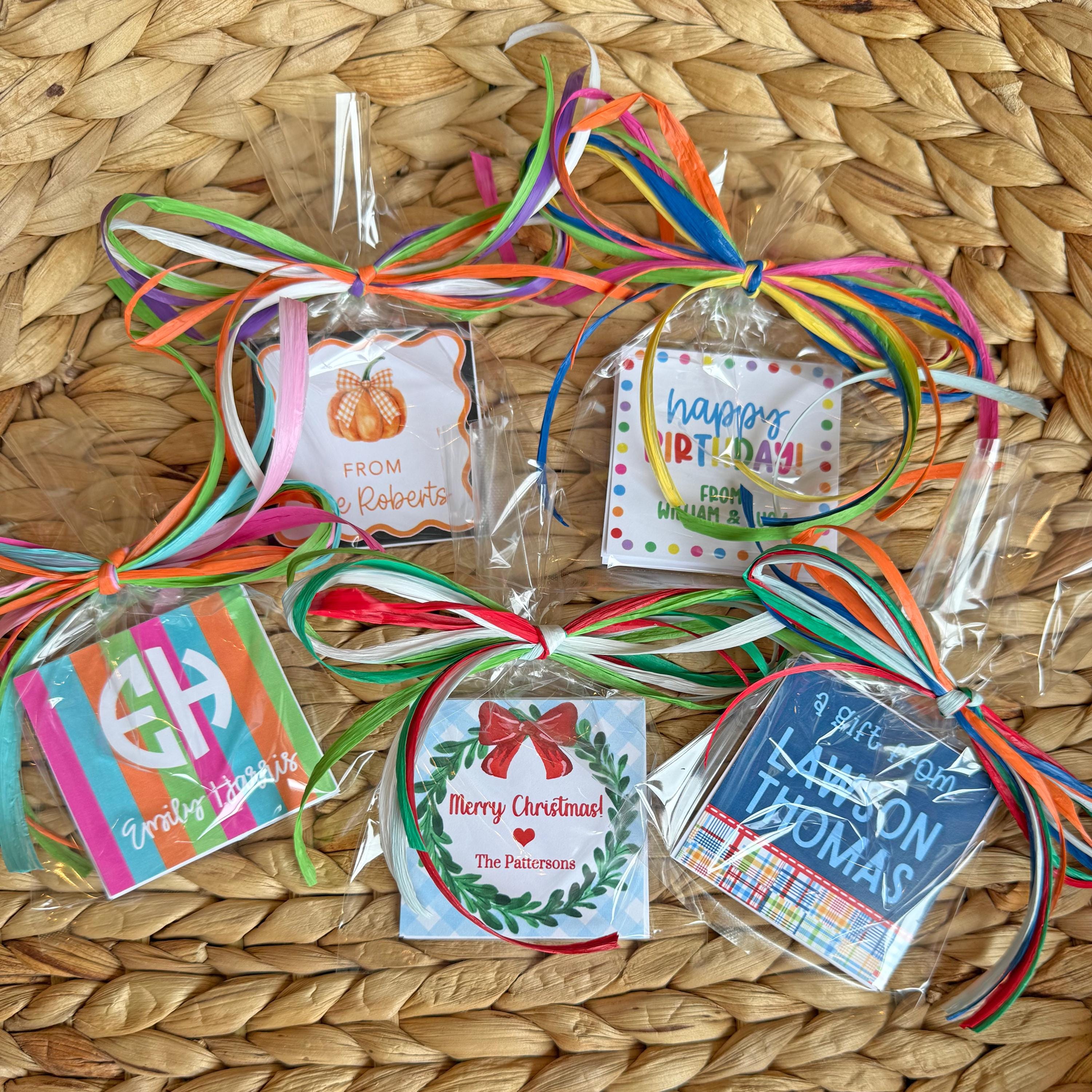 Personalized, preppy gift tags -- the perfect finishing touch to any gift! Each set is wrapped in a clear cello bag tied off with colorful raffia, which makes them a perfect gift as well!