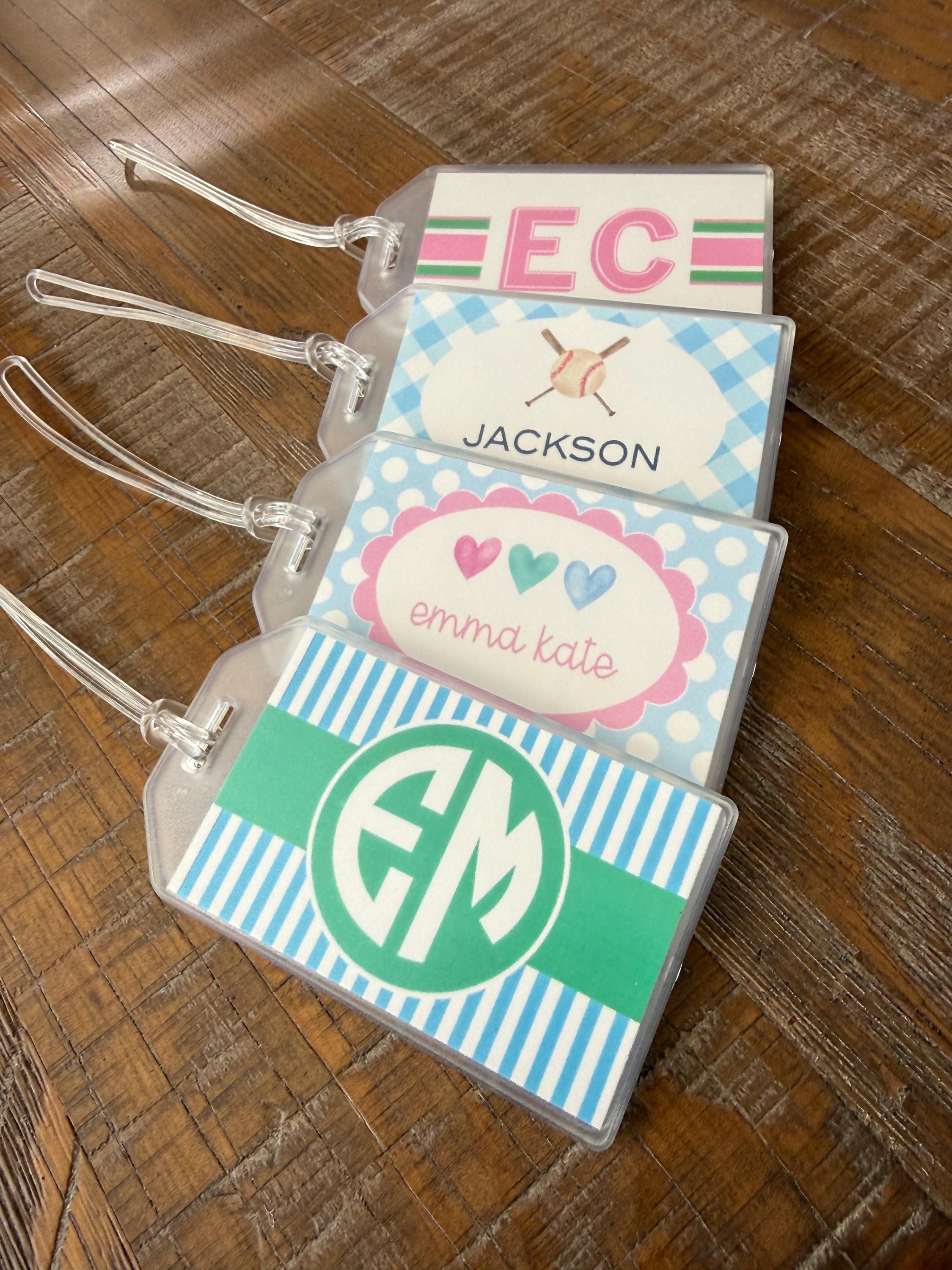 Personalized, preppy luggage tags! These are perfect for kids backpacks, sports bags, preschool totes, diaper bags, beach bag, luggage and much more! They are wrapped in clear cello tied off with colorful raffia, which makes them perfect for gift-giving!