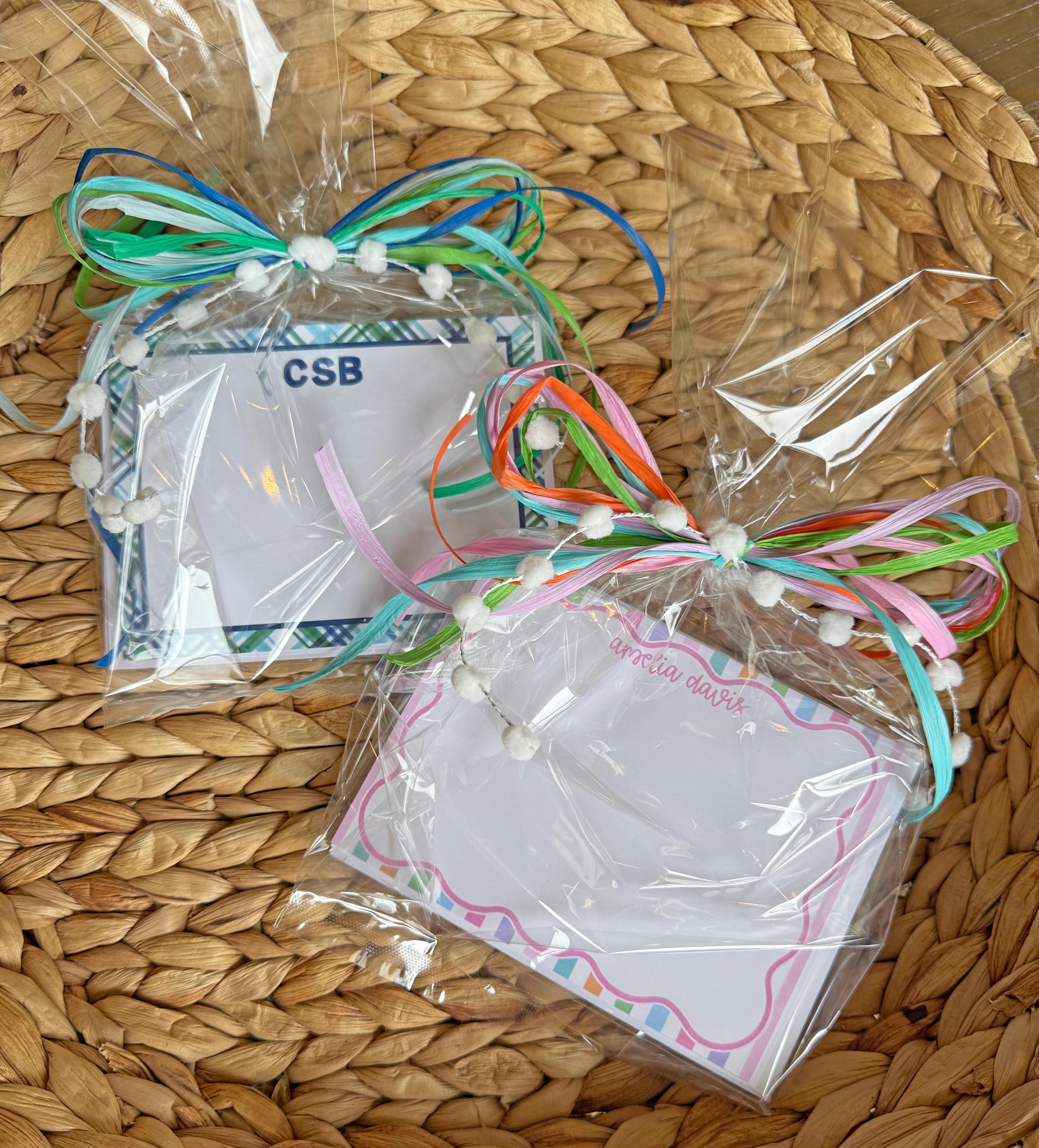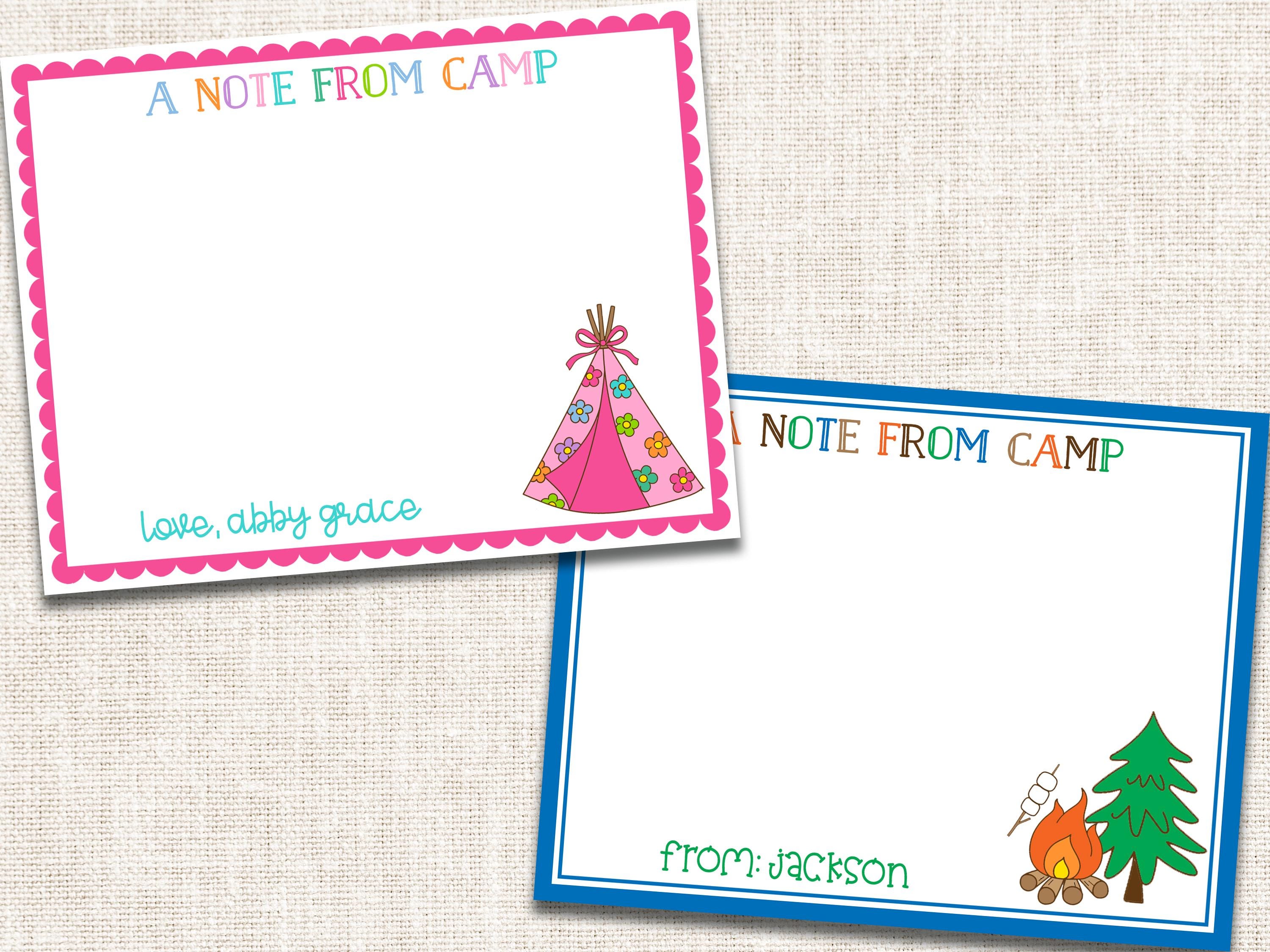 Personalized "a note from camp" notecards! The perfect stationery for boys or girls going off to summer camp! Each set is wrapped in clear cello tied off with colorful raffia, which makes them a perfect gift as well!